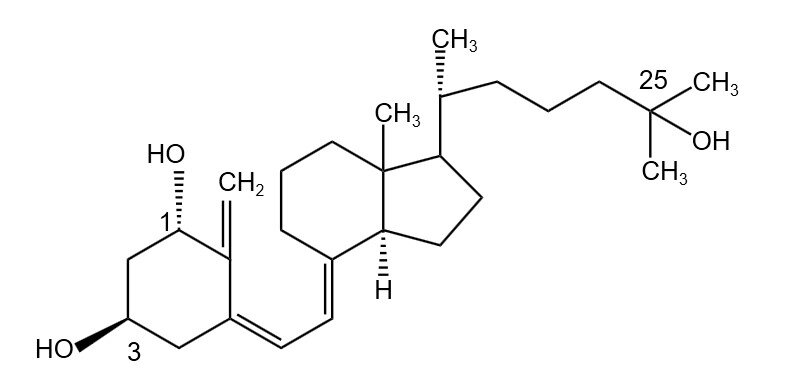 Calcitriol is a white, crystalline compound which occurs naturally in humans. It has a calculated molecular weight of 416.65 and is soluble in organic solvents but relatively insoluble in water. Chemically, calcitriol is 9,10- seco(5Z,7E)-5,7,10(19)-cholestatriene-1α, 3β, 25-triol and has the following structural formula: