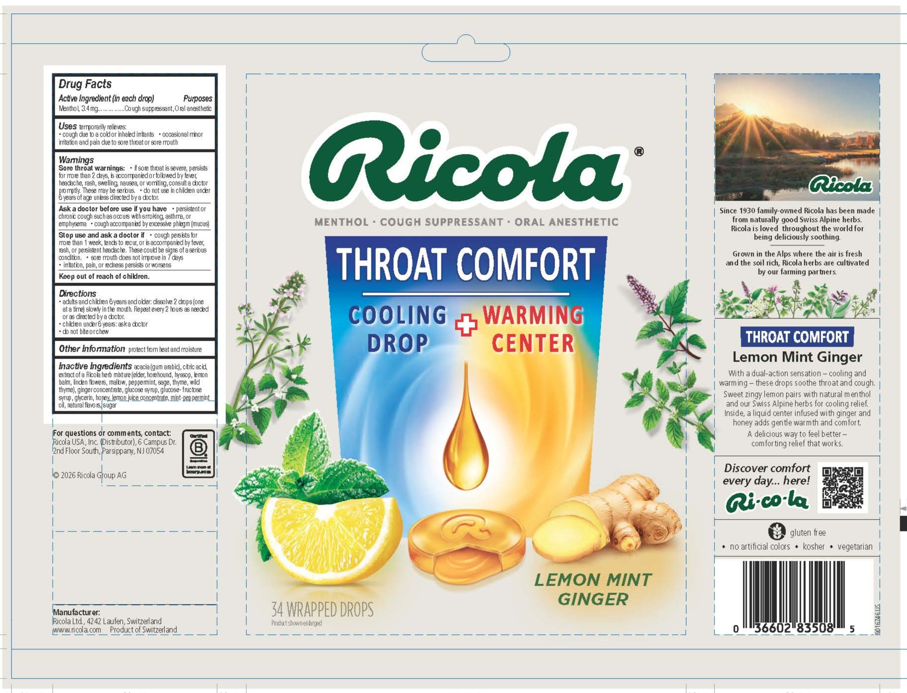 Throat Comfort Lemon Mint Ginger Drops by is a Otc medication manufactured, distributed, or labeled by Ricola USA Inc., Ricola Ag . Drug facts, warnings, and ingredients follow.
