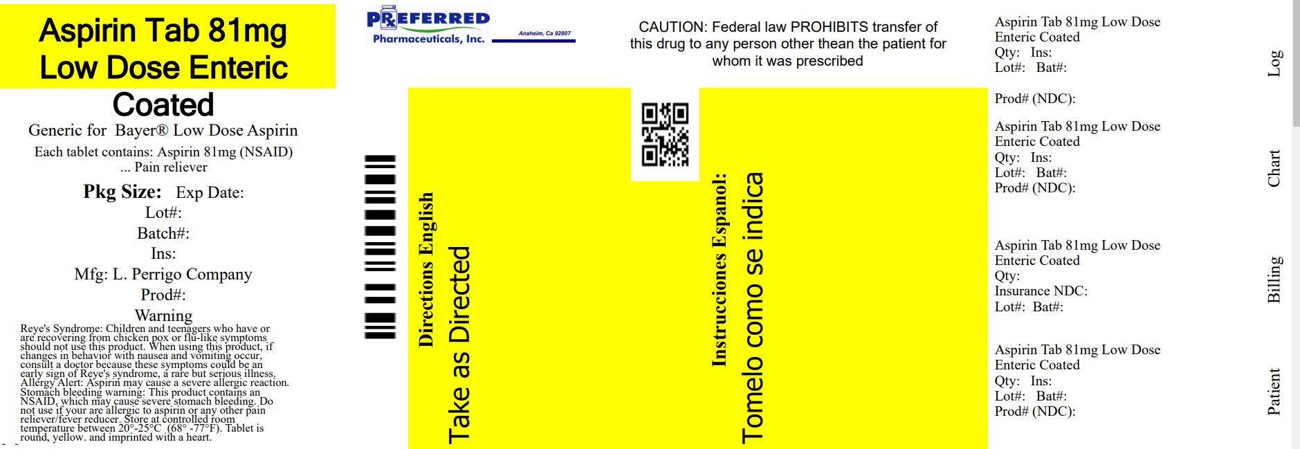 Aspirin by is a Otc medication manufactured, distributed, or labeled by Preferred Pharmaceuticals Inc.. Drug facts, warnings, and ingredients follow.