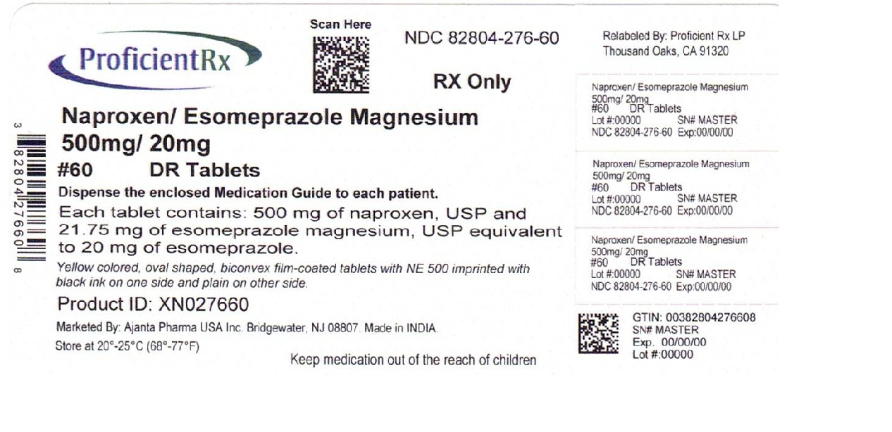 Naproxen and esomeprazole magnesium delayed-release tablets 500 mg/20 mg are yellow colored, oval shaped, biconvex film-coated tablets with NE 500 imprinted with black ink on one side and plain on other side, supplied as: