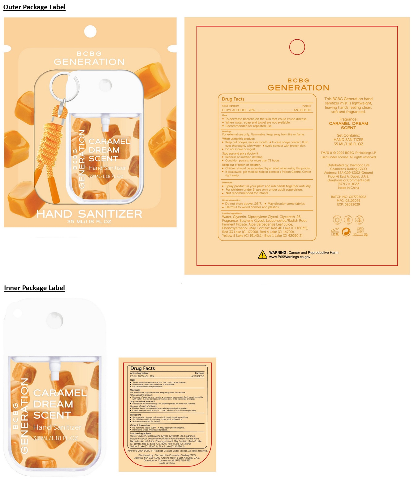 BCBG GENERATION Hand Sanitizer CARAMEL DREAM SCENT by is a Otc medication manufactured, distributed, or labeled by Diamond Life Cosmetics Trading FZCO. Drug facts, warnings, and ingredients follow.