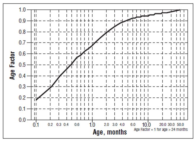 For children aged about 2 years or younger, the pediatric dosage should be reduced by a factor that depends upon age, as shown in the following graph (age plotted on a logarithmic scale in months):