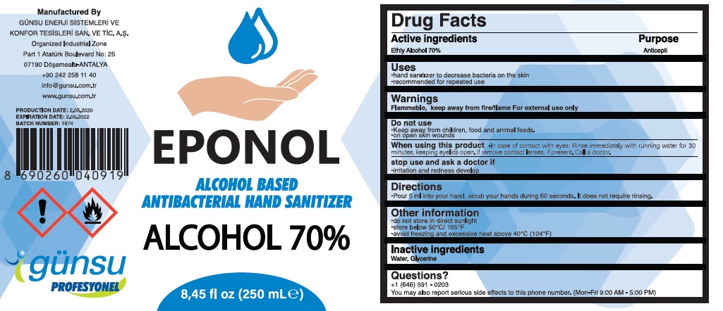 EPONOL by is a Otc medication manufactured, distributed, or labeled by GUNSU ENERJI SISTEMLERI VE KONFOR TESISLERI SANAYI VE TICARET ANONIM SIRKETI. Drug facts, warnings, and ingredients follow.