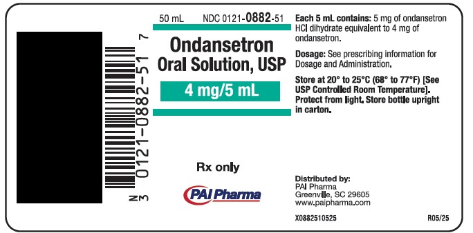 Ondansetron oral solution, USP, a clear colorless to light yellow liquid with strawberry flavor, contains 5 mg of ondansetron HCl dihydrate equivalent to 4 mg of ondansetron per 5 mL in white plastic bottles of 50 mL with child-resistant closures (NDC: 0121-0882-51).