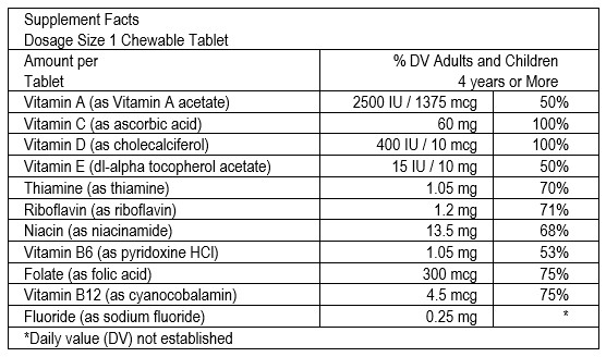 Multivitamin with Fluoride 1.0 mg Chewable Tabletssupply significant amounts of Vitamins A, C, D, E, thiamine, riboflavin, niacin, vitamin B6, vitamin B12, and folate to supplement the diet, and to help assure that nutritional deficiencies of these vitamins will not develop.