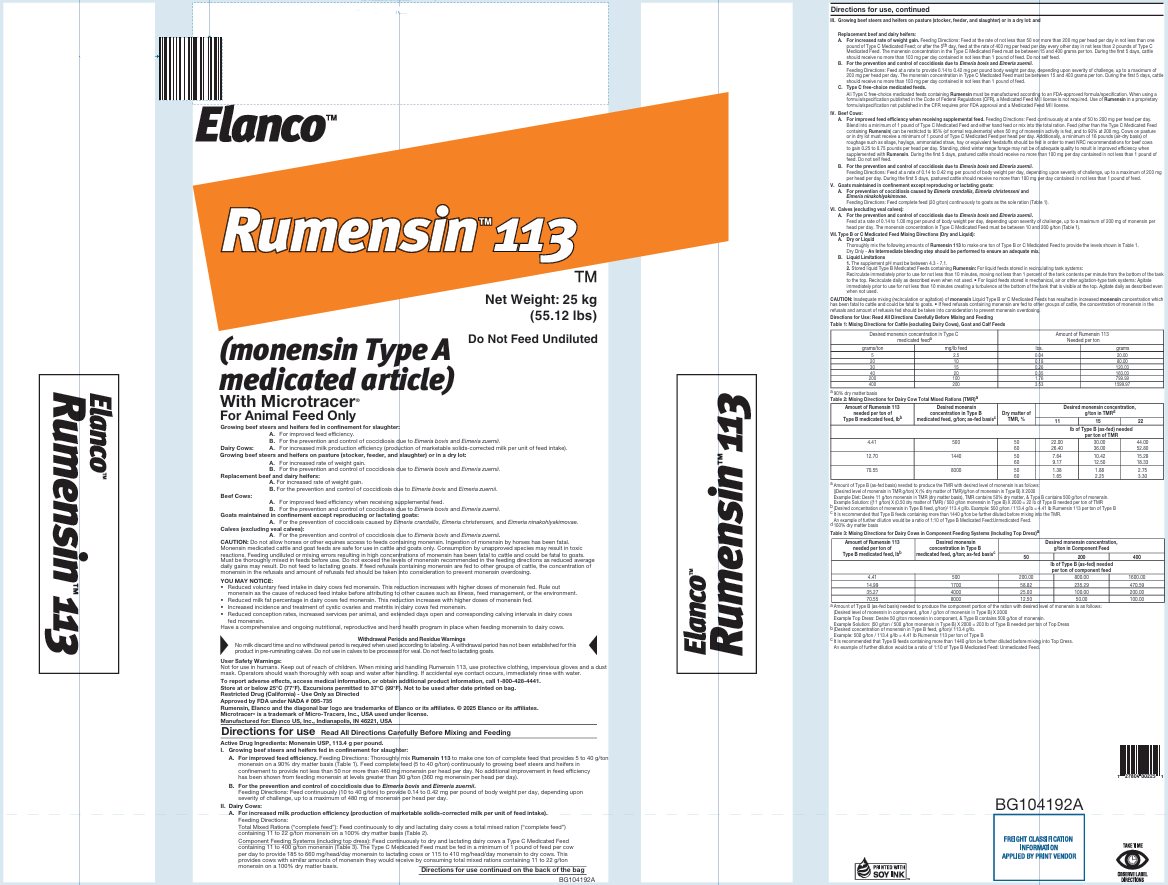 Not for use in humans. Keep out of reach of children. When mixing and handling Rumensin 113, use protective clothing, impervious gloves and a dust mask. Operators should wash thoroughly with soap and water after handling. If accidental eye contact occurs, immediately rinse with water.