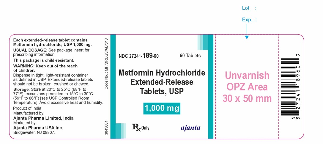 | 1,000 mg | Bottles of 60 with child-resistant closure | NDC: 27241-189-60 | white to off-white colored, oval shaped, unscored biconvex-shaped, film-coated extended-release tablets imprinted with “ME2” in black ink on one side and plain on the other side. |