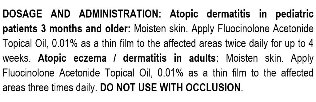 Fluocinolone Acetonide Topical Oil, 0.01% is indicated for the topical treatment of moderate to severe atopic dermatitis in pediatric patients, 3 months and older for up to 4 weeks. Safety and effectiveness in pediatric patients younger than 3 months of age have not been established.