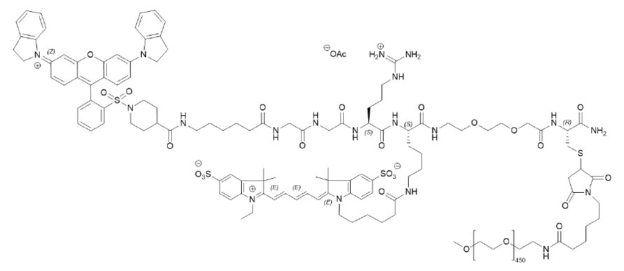 The chemical name of pegulicianine acetate is N-[6-(1-{2-[3,6-bis(2,3-dihydro-1H-indol-1-yl)xanthylium-9-yl]benzene-1-sulfonyl}piperidine-4-carboxamido)hexanoyl]glycylglycyl-L-arginyl-N6-(6-{2-[(1E,3E,5Z)-5-(1-ethyl-3,3-dimethyl-5-sulfonato-1,3-dihydro-2H-indol-2-ylidene)penta-1,3-dien-1-yl]-3,3-dimethyl-5-sulfonato-3H-indol-1-ium-1-yl}hexanoyl)-Llysyl-[2-(2-aminoethoxy)ethoxy]acetyl-S-[(3RS)-1-{6-[α-methylpoly(oxyethylene)-ω-amino]-6-oxohexyl}-2,5-dioxopyrrolidin-3-yl]-L-cysteinamide acetate with a molecular formula of C116H147N19O23S4(C2H4O)n, with n of approximately 450, a molecular weight of 20-25 kDa, and the following structural formula: