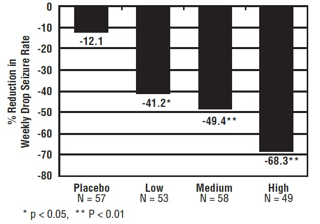 The primary efficacy measure was the percent reduction in the weekly frequency of drop seizures (atonic, tonic, or myoclonic), also known as drop attacks, from the 4-week baseline period to the 4-week maintenance period.