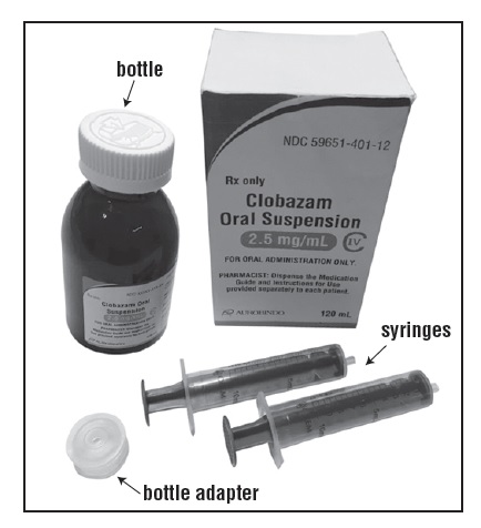 Step 1. Remove the clobazam oral suspension bottle, bottle adapter, and 1 syringe from the box.