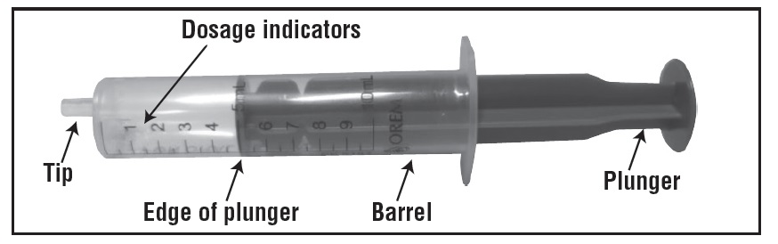 Step 4. Check your dose in milliliters (mL) as prescribed by your healthcare provider. Find this number on the syringe. Do not take more than the prescribed total dose in 1 day. See Figure D