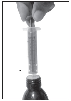 Step 6. With the syringe in place, turn the bottle upside down. Pull the plunger to the number of mLs needed (the amount of liquid medicine in Step 4). See Figure F