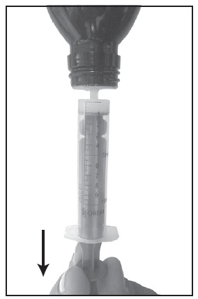 Step 5. Push the plunger all the way down and then insert the syringe into the upright bottle through the opening in the bottle adapter. See Figure E
