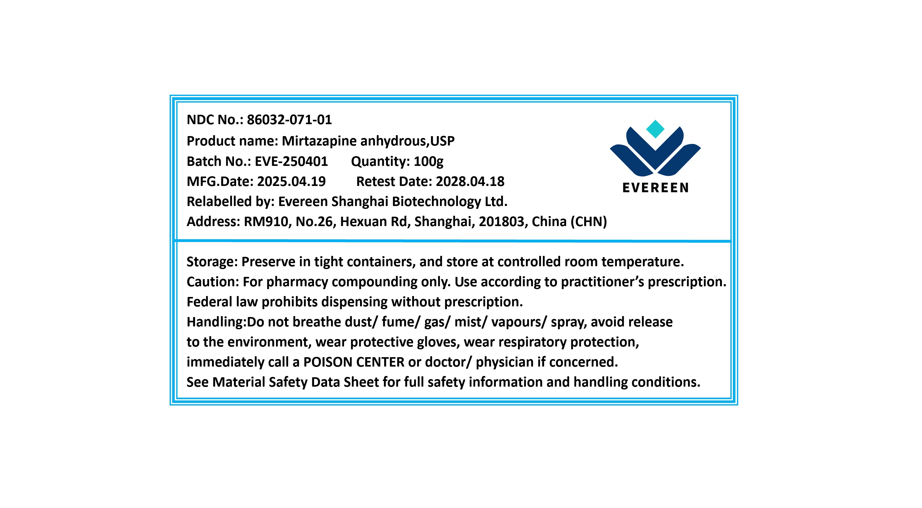 Mirtazapine anhydrous by is a Other medication manufactured, distributed, or labeled by Evereen Shanghai Biotechnology Ltd., Zhejiang Liaoyuan Pharmaceutical Co., Ltd.. Drug facts, warnings, and ingredients follow.