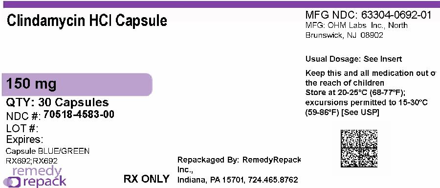 Clindamycin hydrochloride capsules, USP, 150 mgare size ‘1’ capsules with turquoise blue opaque cap and light green body imprinted with “RX692”on cap and body in black ink containing white to off white powder. They are supplied as follows: