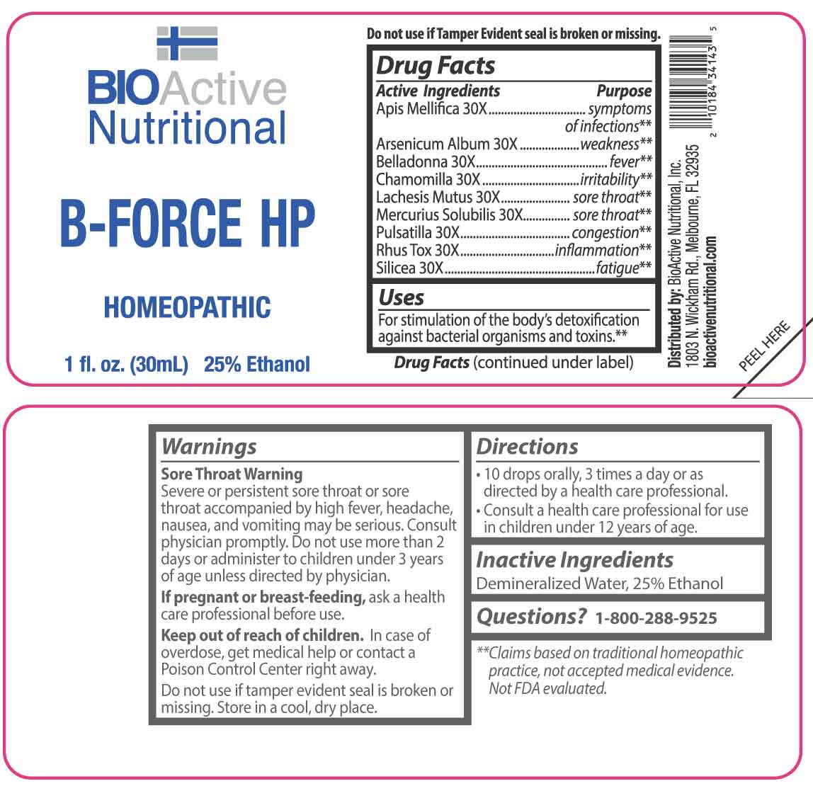 B Force HP by is a Homeopathic medication manufactured, distributed, or labeled by BioActive Nutritional, Inc., Apotheca Company. Drug facts, warnings, and ingredients follow.
