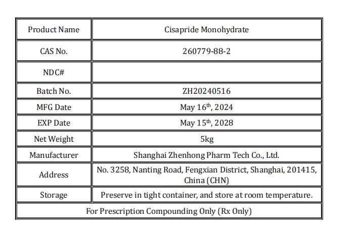 Cisapride Monohydrate by is a Other medication manufactured, distributed, or labeled by Shanghai Zhenhong Pharm Tech Co., Ltd.. Drug facts, warnings, and ingredients follow.