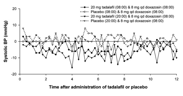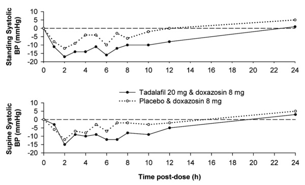 As with other PDE5 inhibitors, tadalafil has mild systemic vasodilatory properties that may result in transient decreases in blood pressure. In a clinical pharmacology study, tadalafil 20 mg resulted in a mean maximal decrease in supine blood pressure, relative to placebo, of 1.6/0.8 mm Hg in healthy subjects [see Clinical Pharmacology ( 12.2)] . While this effect should not be of consequence in most patients, prior to prescribing tadalafil tablets, physicians should carefully consider whether their patients with underlying cardiovascular disease could be affected adversely by such vasodilatory effects. Patients with severely impaired autonomic control of blood pressure may be particularly sensitive to the actions of vasodilators, including PDE5 inhibitors.