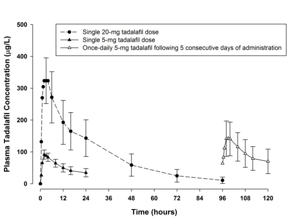 In eight primary placebo-controlled clinical studies of 12 weeks duration, mean age was 59 years (range 22 to 88) and the discontinuation rate due to adverse events in patients treated with tadalafil 10 or 20 mg was 3.1%, compared to 1.4% in placebo treated patients.