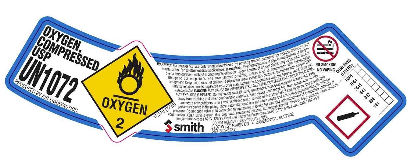 WARNING: For emergency use only when administered by properly trained personnel for oxygen deficiency and resuscitation. For all other medical applications, Rx only. Uninterrupted use of high concentrations of oxygen over a long duration, without monitoring its effect on oxygen content of arterial blood, may be harmful. Do not attempt to use on patients who have stopped breathing unless used in conjunction with resuscitative equipment. Keep out of reach of children. Federal law requires that this container be refilled with oxygen USP only by establishments registered as a drug manufacturer in accordance with the Federal Food, Drug and Cosmetic Act. DANGER: MAY CAUSE OR INTENSIFY FIRE; OXIDIZER. CONTAINS GAS UNDER PRESSURE; MAY EXPLODE IF HEATED. Do not handle until all safety precautions have been read and understood. Keep and store away from clothing and other combustible materials. Keep valves and fittings free from grease and oil. Use and store only outdoors or in a well-ventilated place. In case of fire: Stop leak if safe to do so. Use a back flow preventive device in the piping. Use only with equipment of compatible materials of construction and rated for cylinder pressure. Use only with equipment cleaned for oxygen service. Open valve slowly. Close valve after each use and when empty. Protect from sunlight when ambient temperature exceeds 52 C (125 F). Read and follow the Safety Data Sheet (SDS) before use. CAS 7782-44-7
