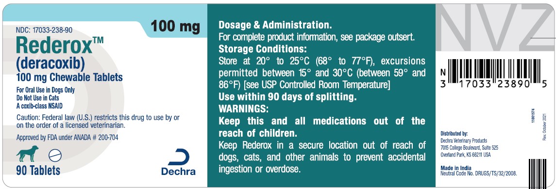 Since deracoxib tablet bioavailability is greatest when taken with food, postprandial administration is preferable. However, deracoxib tablets have been shown to be effective under both fed and fasted conditions; therefore, they may be administered in the fasted state if necessary. For postoperative orthopedic and dental pain, administer Rederox Chewable Tablets prior to the procedure. Tablets are scored and dosage should be calculated in half-tablet increments. In clinical practice it is recommended to adjust the individual patient dose while continuing to monitor the dog's status until a minimum effective dose has been reached.