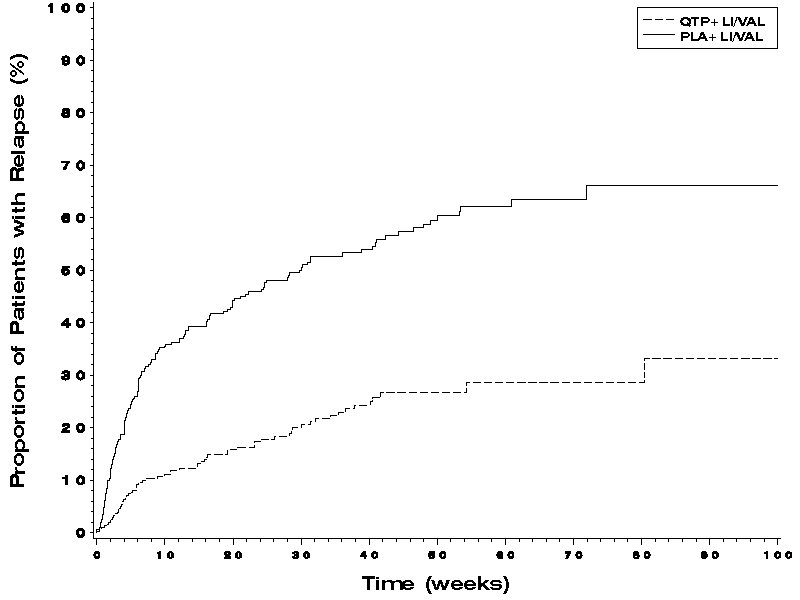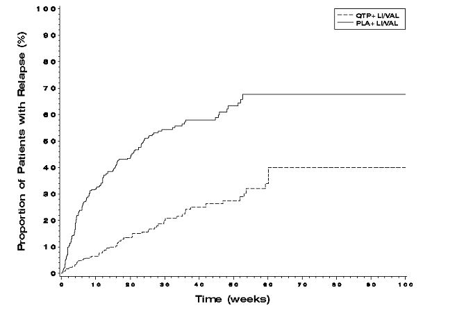 In both studies, SEROQUEL was superior to placebo in increasing the time to recurrence of any mood event. The treatment effect was present for increasing time to recurrence of both manic and depressed episodes. The effect of SEROQUEL was independent of any specific subgroup (assigned mood stabilizer, sex, age, race, most recent bipolar episode, or rapid cycling course).