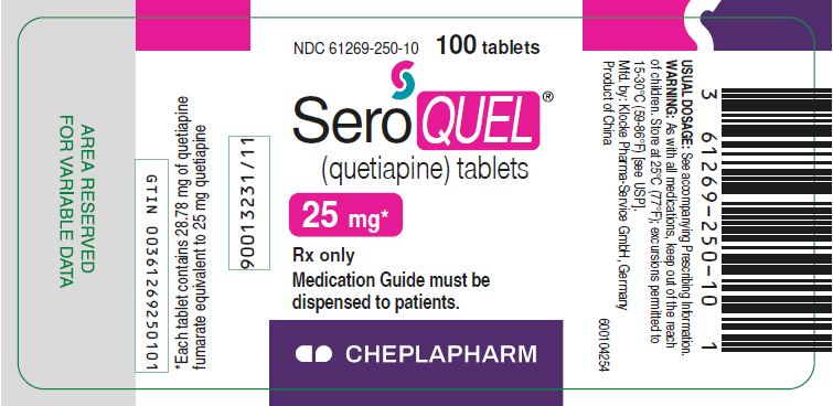 25 mg Tablets (NDC: 61269-250-10) peach, round, biconvex, film coated tablets, identified with ‘SEROQUEL’ and ‘25’ on one side and plain on the other side, are supplied in bottles of 100 tablets.