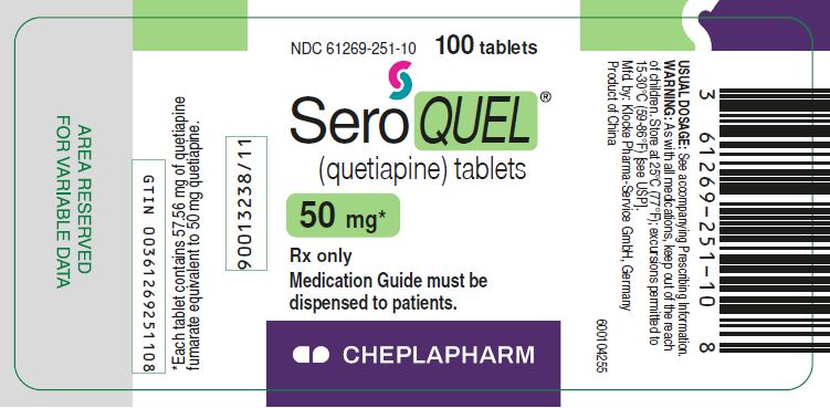 50 mg Tablets (NDC: 61269-251-10) white, round, biconvex, film coated tablets, identified with ‘SEROQUEL’ and ‘50’ on one side and plain on the other side, are supplied in bottles of 100 tablets.