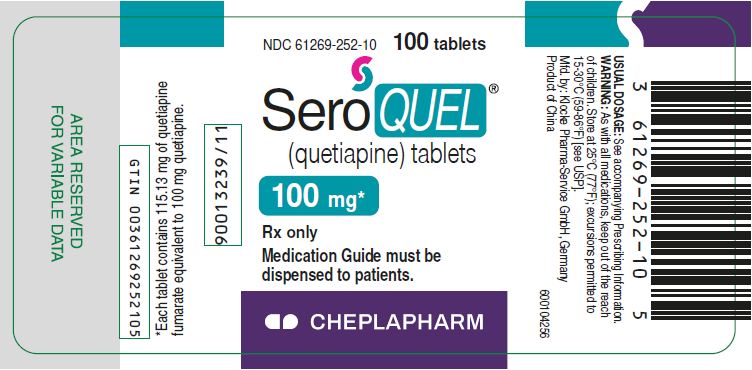 100 mg Tablets (NDC: 61269-252-10) yellow, round, biconvex film coated tablets, identified with ‘SEROQUEL’ and ‘100’ on one side and plain on the other side, are supplied in bottles of 100 tablets.