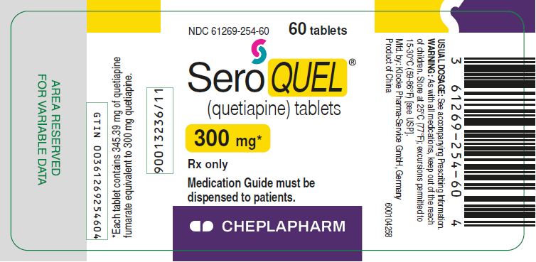 300 mg Tablets (NDC: 61269-254-60) white, capsule-shaped, biconvex, film coated tablets, intagliated with ‘SEROQUEL’ on one side and ‘300’ on the other side, are supplied in bottles of 60 tablets.
