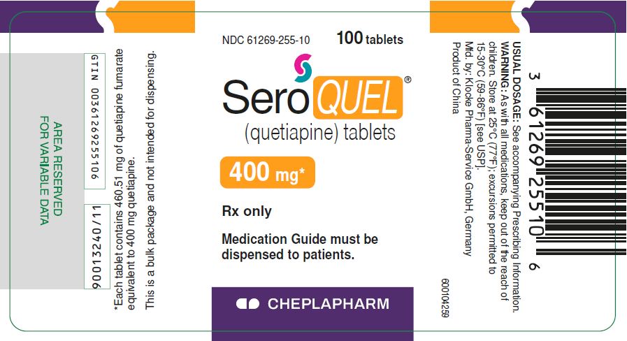 400 mg Tablets (NDC: 61269-255-10) yellow, capsule-shaped, biconvex, film coated tablets, intagliated with ‘SEROQUEL’ on one side and ‘400’ on the other side, are supplied in bottles of 100 tablets.