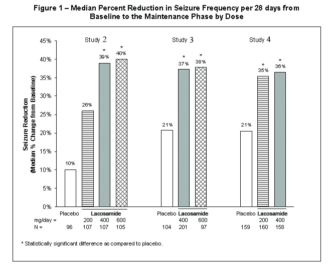 A reduction in 28-day seizure frequency (baseline to maintenance phase), as compared to the placebo group, was the primary variable in all three adjunctive therapy trials. A statistically significant effect was observed with lacosamide treatment (Figure 1) at doses of 200 mg/day (Study 4), 400 mg/day (Studies 2, 3, and 4), and 600 mg/day (Studies 2 and 3).