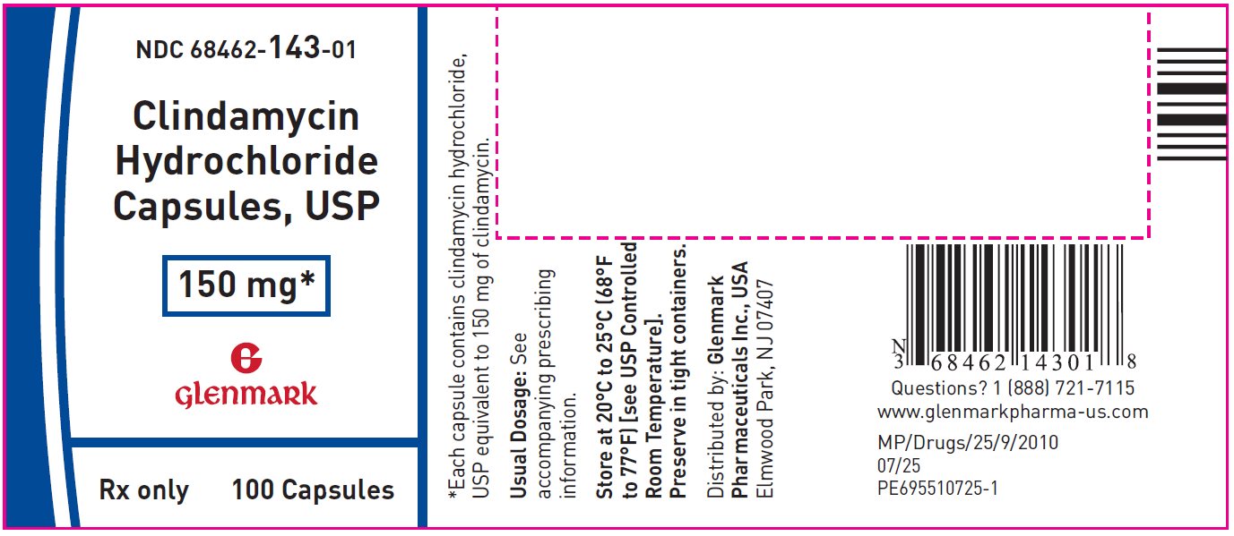 Clindamycin Hydrochloride Capsules, USP 150 mg are size ‘1’ hard gelatin capsules with a light blue opaque cap and a light green opaque body, imprinted with “G” on the cap and “143” on the body with black ink and filled with white to off-white powder. They are supplied as follows: