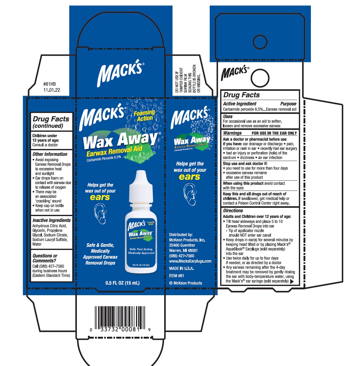 Wax Away Earwax Removal Aid by is a Otc medication manufactured, distributed, or labeled by McKeon Products Inc, Bell Pharmaceuticals, Inc.. Drug facts, warnings, and ingredients follow.