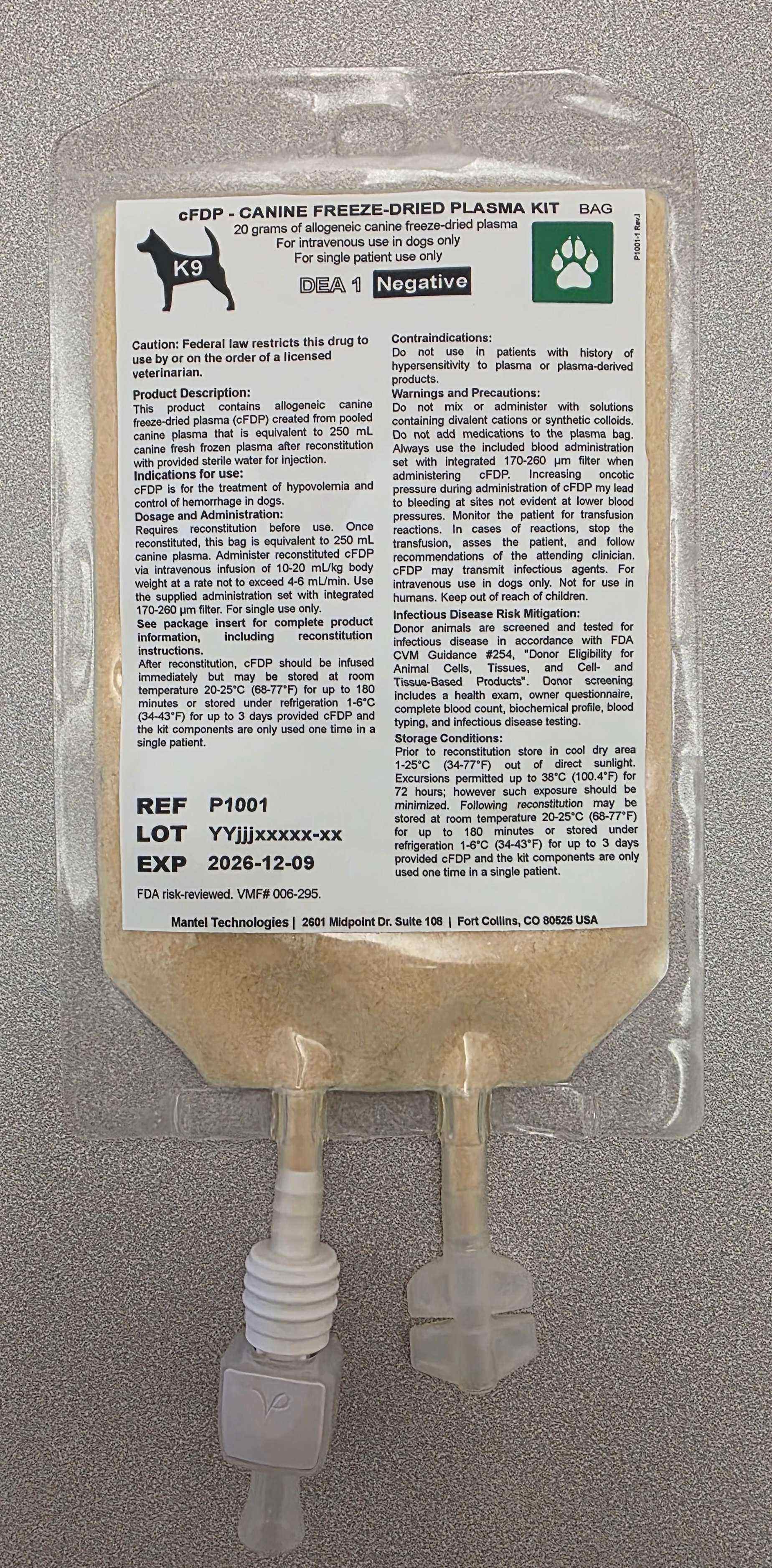 Donor animals were screened and tested for infectious diseases in accordance with FDA CVM Guidance #254, "Donor Eligibility for Animal Cells, Tissues, and Cell- and Tissue-Based Products". Mantel determined eligibility for each individual donor dog based on historical eligibility criteria, health exams, owner questionnaires, complete blood count, biochemical profile, blood typing, and infectious disease testing. These measures are expected to reduce but not eliminate the risk of transmitting infectious disease agents. See the Certificate of Analysis for more information about screening procedures and disease tests performed to determine donor eligibility.
