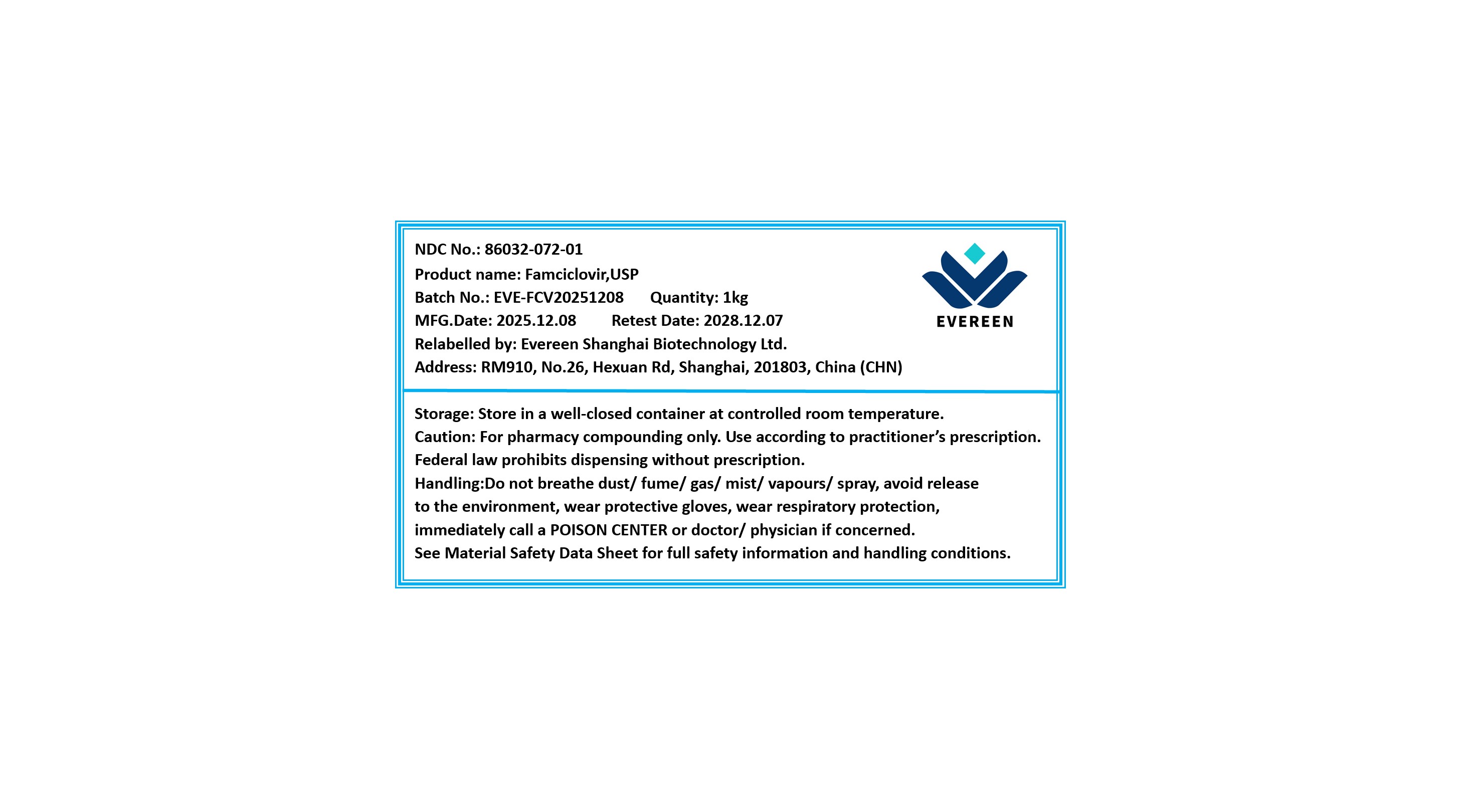 Famciclovir by is a Other medication manufactured, distributed, or labeled by Evereen Shanghai Biotechnology Ltd., Shanghai Pharma Group Changzhou Kony Pharmaceutical Co., Ltd.. Drug facts, warnings, and ingredients follow.