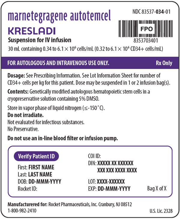 KRESLADI is supplied in one or two infusion bags containing a frozen suspension of genetically modified autologous cells enriched for CD34+ cells in a cryo-preservative medium containing 5% DMSO and dextran 40. Each infusion bag contains approximately 30 mL and is individually packed within an overwrap in a metal cassette for protection. KRESLADI is shipped from the manufacturing facility to the infusion center in a cryoshipper, which may contain one or two cassettes intended for treatment of a single patient. A Lot Information Sheet is affixed inside the shipper.