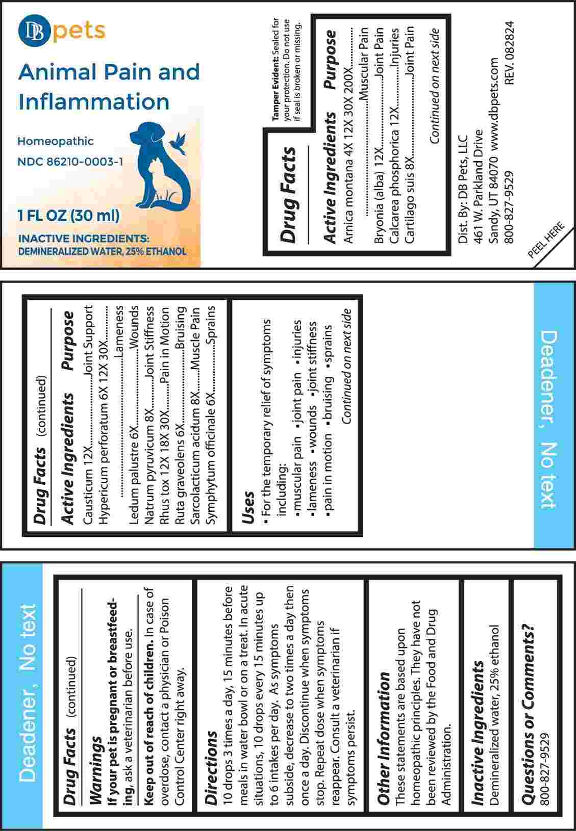 Animal Pain and Inflammation by is a Homeopathic medication manufactured, distributed, or labeled by DB Pets LLC, Apotheca Company. Drug facts, warnings, and ingredients follow.