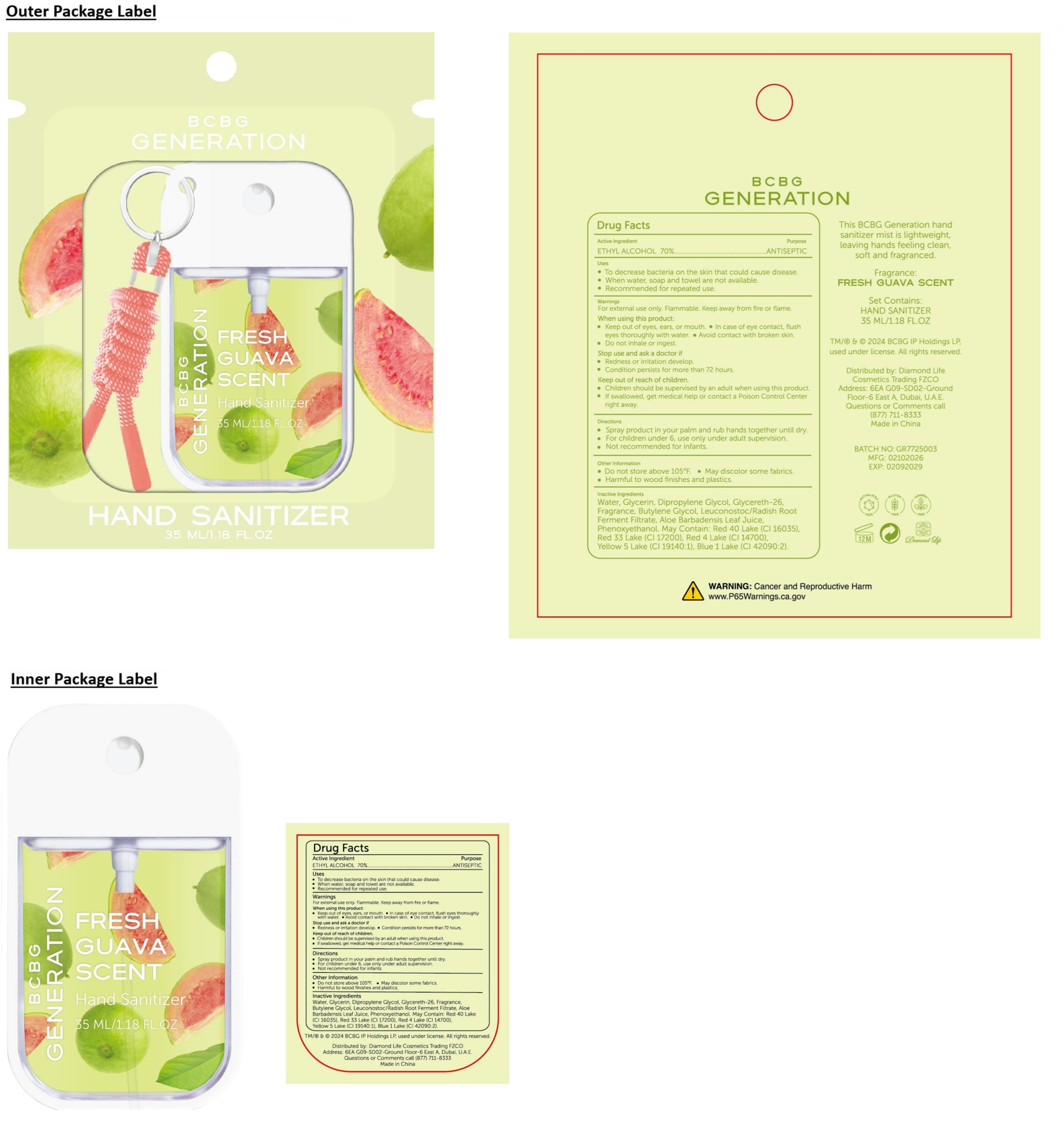BCBG GENERATION Hand Sanitizer FRESH GUAVA SCENT by is a Otc medication manufactured, distributed, or labeled by Diamond Life Cosmetics Trading FZCO. Drug facts, warnings, and ingredients follow.