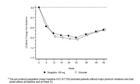 After 52 weeks, sitagliptin and glipizide had similar mean reductions from baseline in A1C in the intent-to-treat analysis (Table 15). These results were consistent with the per protocol analysis (Figure 2). A conclusion in favor of the non-inferiority of sitagliptin to glipizide may be limited to patients with baseline A1C comparable to those included in the study (over 70% of patients had baseline A1C less than 8% and over 90% had A1C less than 9%).