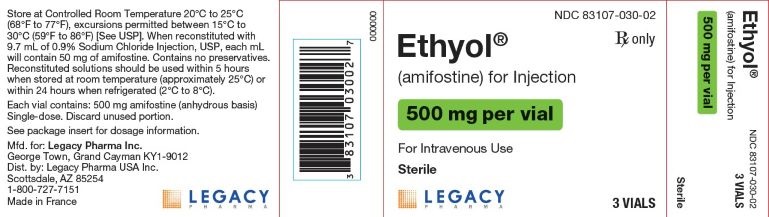 ETHYOL (amifostine) for Injection is supplied as a sterile lyophilized white powder in 10 mL single-dose vials (NDC: 83107-030-01). Each vial contains 500 mg of amifostine on the anhydrous basis. The vials are available packaged as follows: