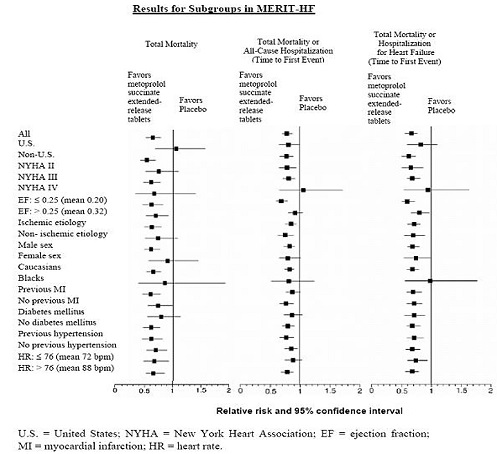 MERIT-HF was a randomized double-blind, placebo-controlled study of metoprolol succinate extended-release tablets in which 3,991 patients with ejection fraction ≤0.40 and NYHA Class II-IV heart failure attributable to ischemia, hypertension, or cardiomyopathy were randomized 1:1 to metoprolol succinate extended-release tablets or placebo. The protocol excluded patients with contraindications to beta-blocker use, those expected to undergo heart surgery, and those within 28 days of myocardial infarction or unstable angina. The primary endpoints of the trial were (1) all-cause mortality plus all-cause hospitalization (time to first event) and (2) all-cause mortality. Patients were stabilized on optimal concomitant therapy for heart failure, including diuretics, ACE inhibitors, cardiac glycosides, and nitrates. At randomization, 41% of patients were NYHA Class II; 55% NYHA Class III; 65% of patients had heart failure attributed to ischemic heart disease; 44% had a history of hypertension; 25% had diabetes mellitus; 48% had a history of myocardial infarction. Among patients in the trial, 90% were on diuretics, 89% were on ACE inhibitors, 64% were on digitalis, 27% were on a lipid-lowering agent, 37% were on an oral anticoagulant, and the mean ejection fraction was 0.28. The mean duration of follow-up was one year. At the end of the study, the mean daily dose of metoprolol succinate extended-release tablets was 159 mg.