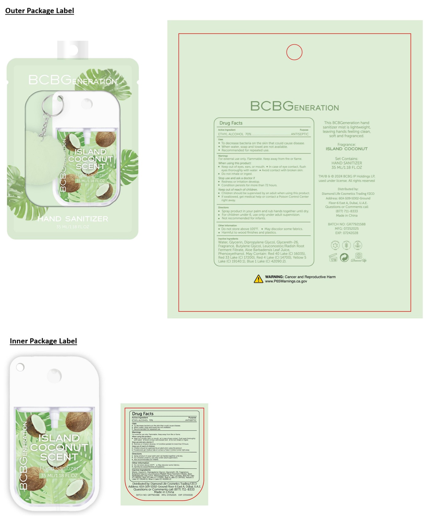 BCBGENERATION Hand Sanitizer ISLAND COCONUT SCENT by is a Otc medication manufactured, distributed, or labeled by Diamond Life Cosmetics Trading FZCO. Drug facts, warnings, and ingredients follow.