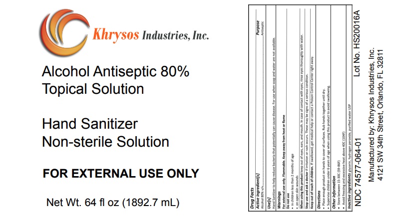 Hand Sanitizer by is a Otc medication manufactured, distributed, or labeled by Khrysos Industries Inc.. Drug facts, warnings, and ingredients follow.