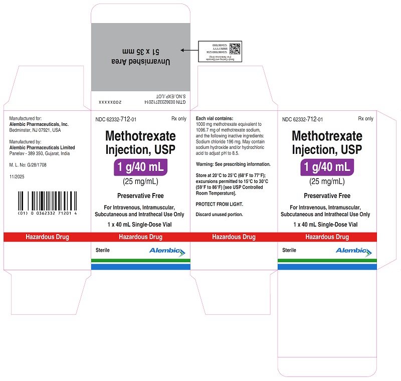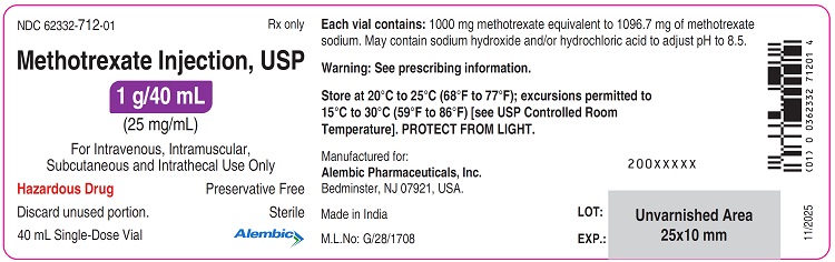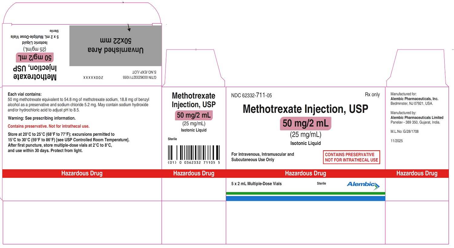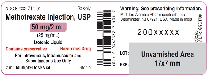 Active ingredient: methotrexate. Inactive ingredients for Methotrexate Injection Preservative-free: sodium chloride. May contain sodium hydroxide and/or hydrochloric acid to adjust pH to 8.5. Inactive ingredients for Methotrexate Injection with Preservative: benzyl alcohol and sodium chloride. May contain sodium hydroxide and/or hydrochloric acid to adjust pH to 8.5. For more information, call 1-866-210-9797. Manufactured for: Alembic Pharmaceuticals, Inc. Bedminster, NJ 07921, USA. Manufactured by: Alembic Pharmaceuticals Limited Panelav - 389 350, Gujarat, India. |