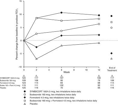 The incidence of common adverse events in Table 2 below is based upon pooled data from three 12-week, double-blind, placebo-controlled clinical studies in which 401 adult and adolescent patients (148 males and 253 females) age 12 years and older were treated with 2 inhalations of SYMBICORT 80/4.5 or SYMBICORT 160/4.5 twice daily. The SYMBICORT group was composed of mostly Caucasian (84%) patients with a mean age of 38 years, and a mean percent predicted FEV 1at baseline of 76 and 68 for the 80/4.5 mcg and 160/4.5 mcg treatment groups, respectively. Control arms for comparison included 2 inhalations of budesonide HFA metered dose inhaler (MDI) 80 or 160 mcg, formoterol dry powder inhaler (DPI) 4.5 mcg, or placebo (MDI and DPI) twice daily. Table 2 includes all adverse events that occurred at an incidence of >3% in any one SYMBICORT group and more commonly than in the placebo group with twice-daily dosing. In considering these data, the increased average duration of patient exposure for SYMBICORT patients should be taken into account, as incidences are not adjusted for an imbalance of treatment duration.