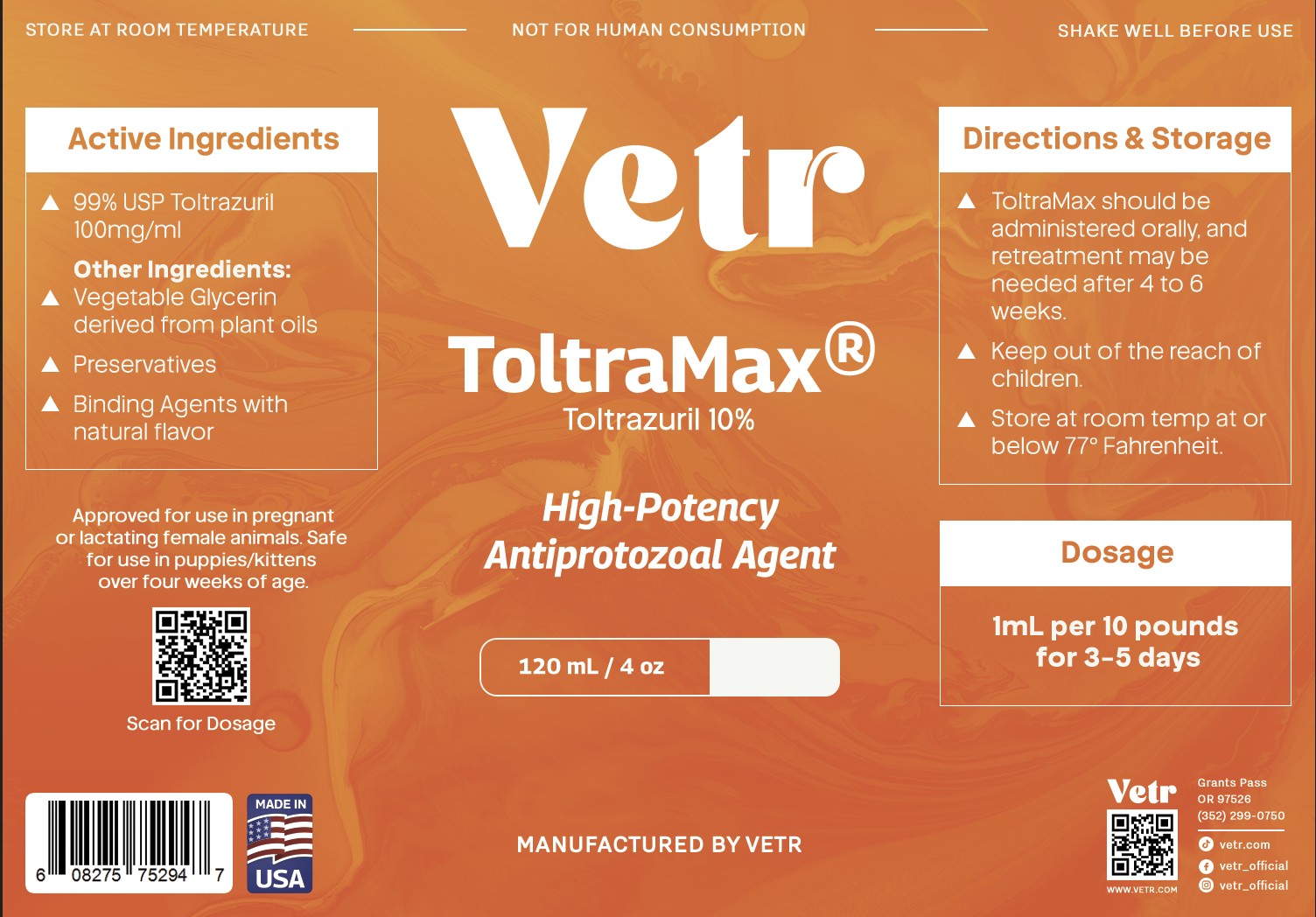 Toltramax 10% suspension by is a Animal medication manufactured, distributed, or labeled by Vetr, LLC, Alivira Animal Health. Drug facts, warnings, and ingredients follow.