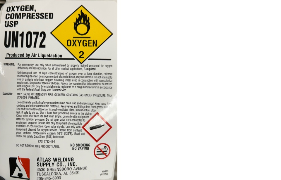 DANGER: MAY CAUSE OR INTENCIFY FIRE; OXYDIZER. CONTAINS GAS UNDER PRESSURE; MAY EXPLODE IF HEATED. Do not handle until all safety precautions have been read and understood. Keep and store away from clothing and other combustible materials. Keep valves and fittings free from grease and oil. Use and store only outdoors or in a well-ventilated place. In case of fire; Stop leak if safe to do so. Use a back flow preventive device in the piping. Use only with equipment of compatible materials of construction and rated for cylinder pressure. Use only with equipment cleaned for oxygen service. Open valve slowly. Close valve after each use and when empty. Protect from sunlight when ambient temperature exceeds 52 C (125 F). Read and follow the Safety Data Sheet (SDS) before use.