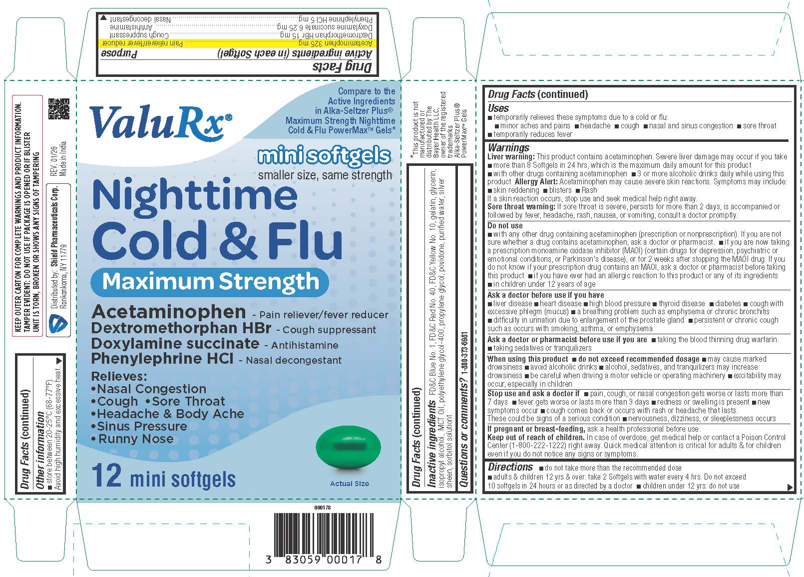 Nighttime Cold and Flu Mini Softgels by is a Otc medication manufactured, distributed, or labeled by Shield Pharmaceuticals Corp. Drug facts, warnings, and ingredients follow.